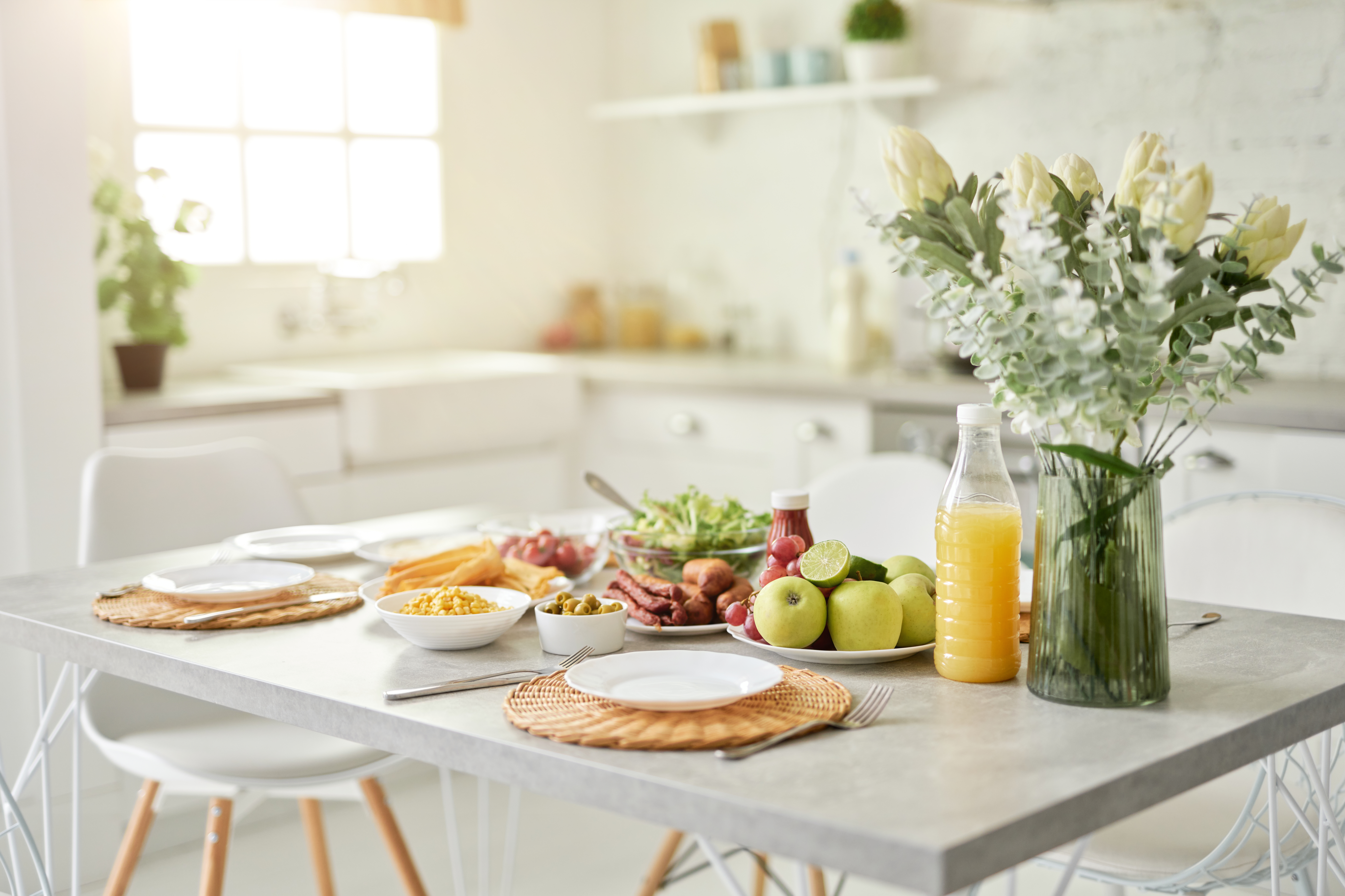 Close up of vase with flowers and Latin style breakfast on the kitchen table. Modern bright white kitchen interior with wooden and white details. Morning, breakfast ideas, interior design concept
