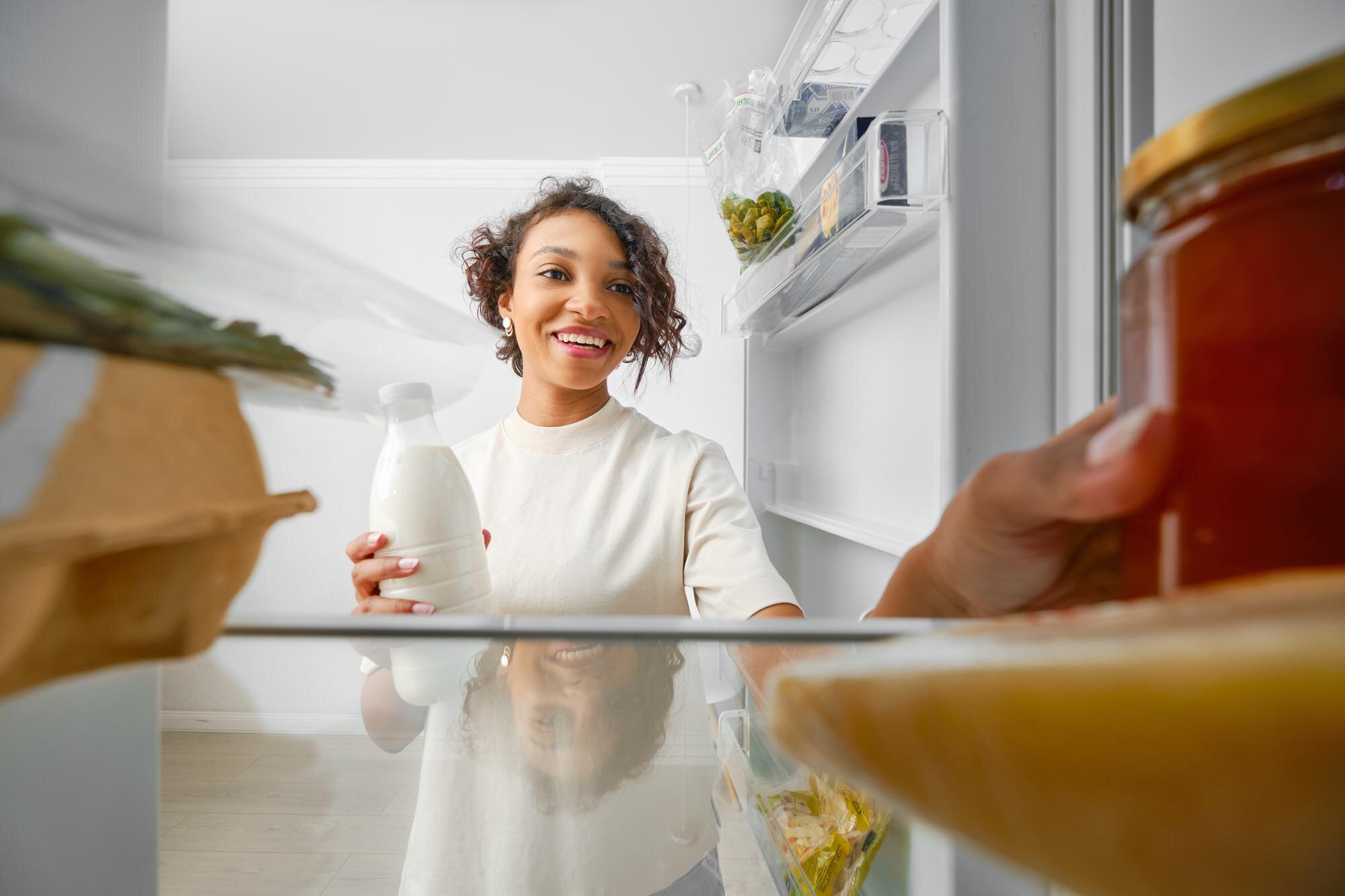 What do i want. Pensive girl looking into refrigerator for late snack, free space