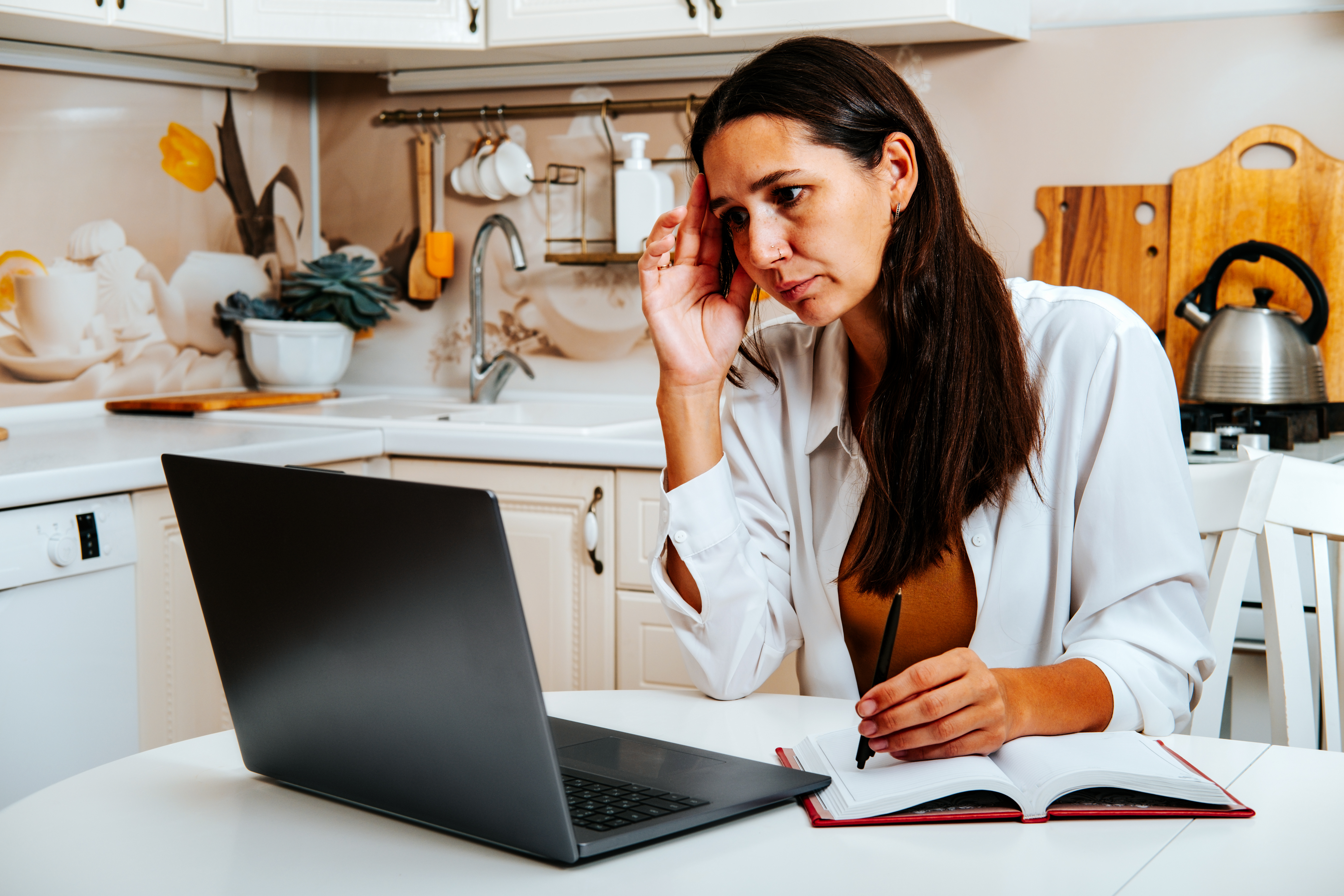 Portrait of female student watching webinar or tutorial studying online on laptop sitting at kitchen table, noting down after teacher or lecturer.
