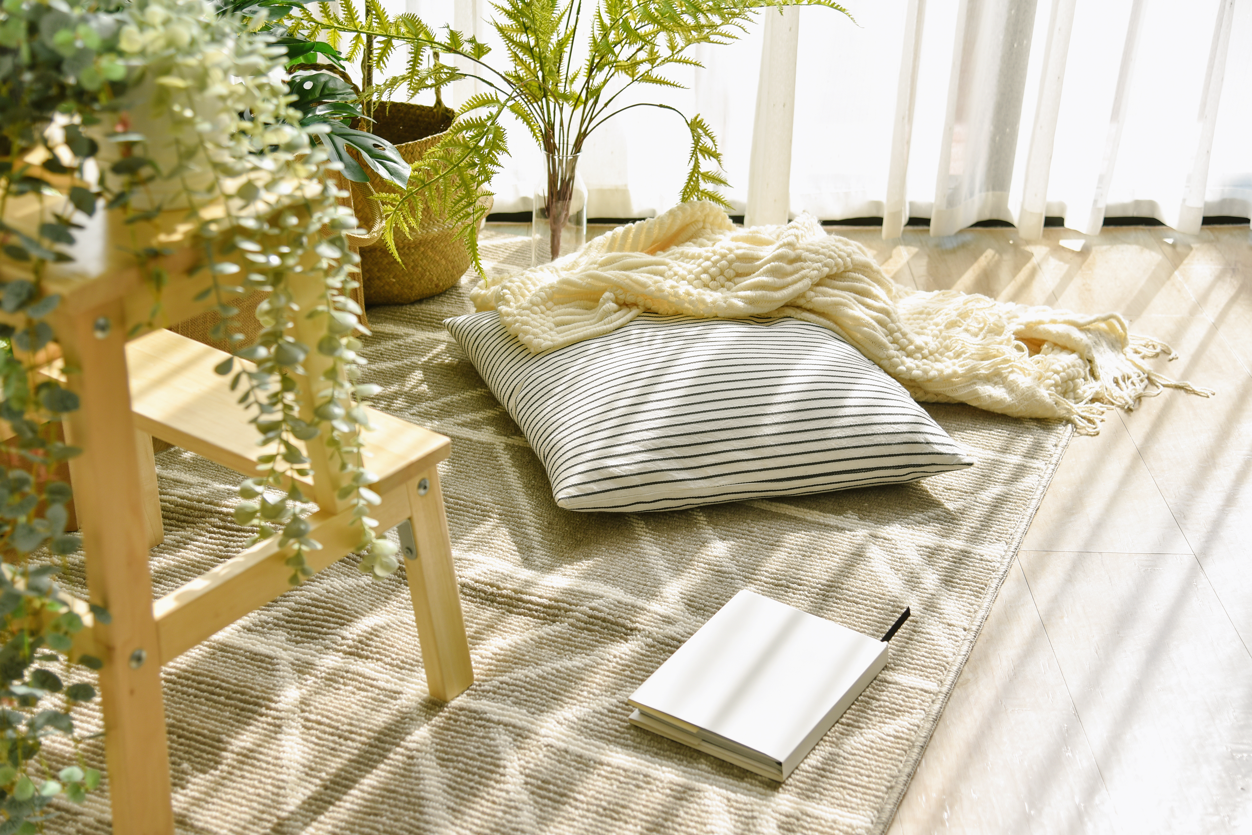 Pillow and soft blanket in relaxing space, Comfort living room with warm and cozy natural light, Artificial plant, Indoor tropical houseplant for home interior and air purification.