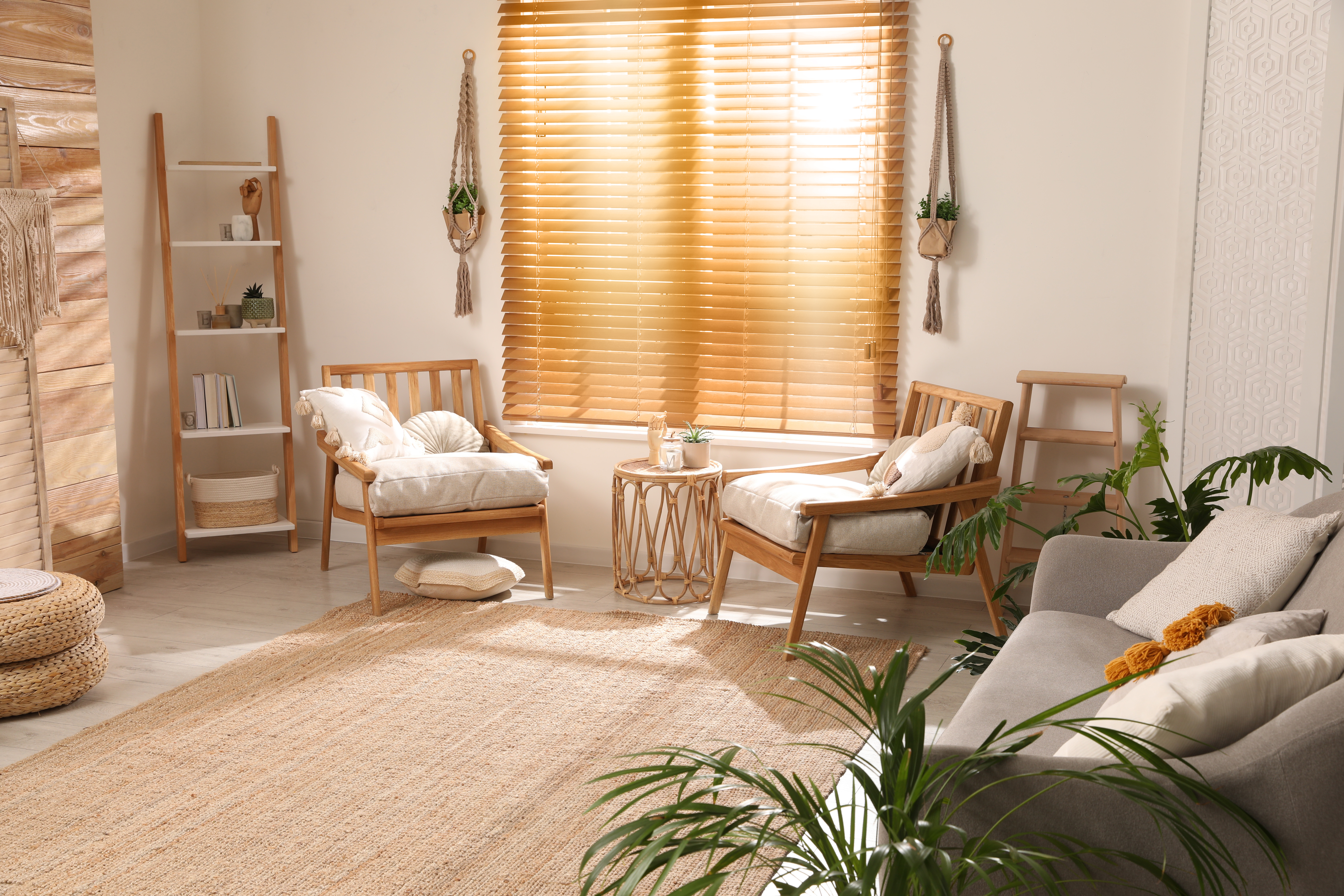 Interior design of scandinavian open space with velvet sofa, plants, furniture, in stylish home staging. Template.