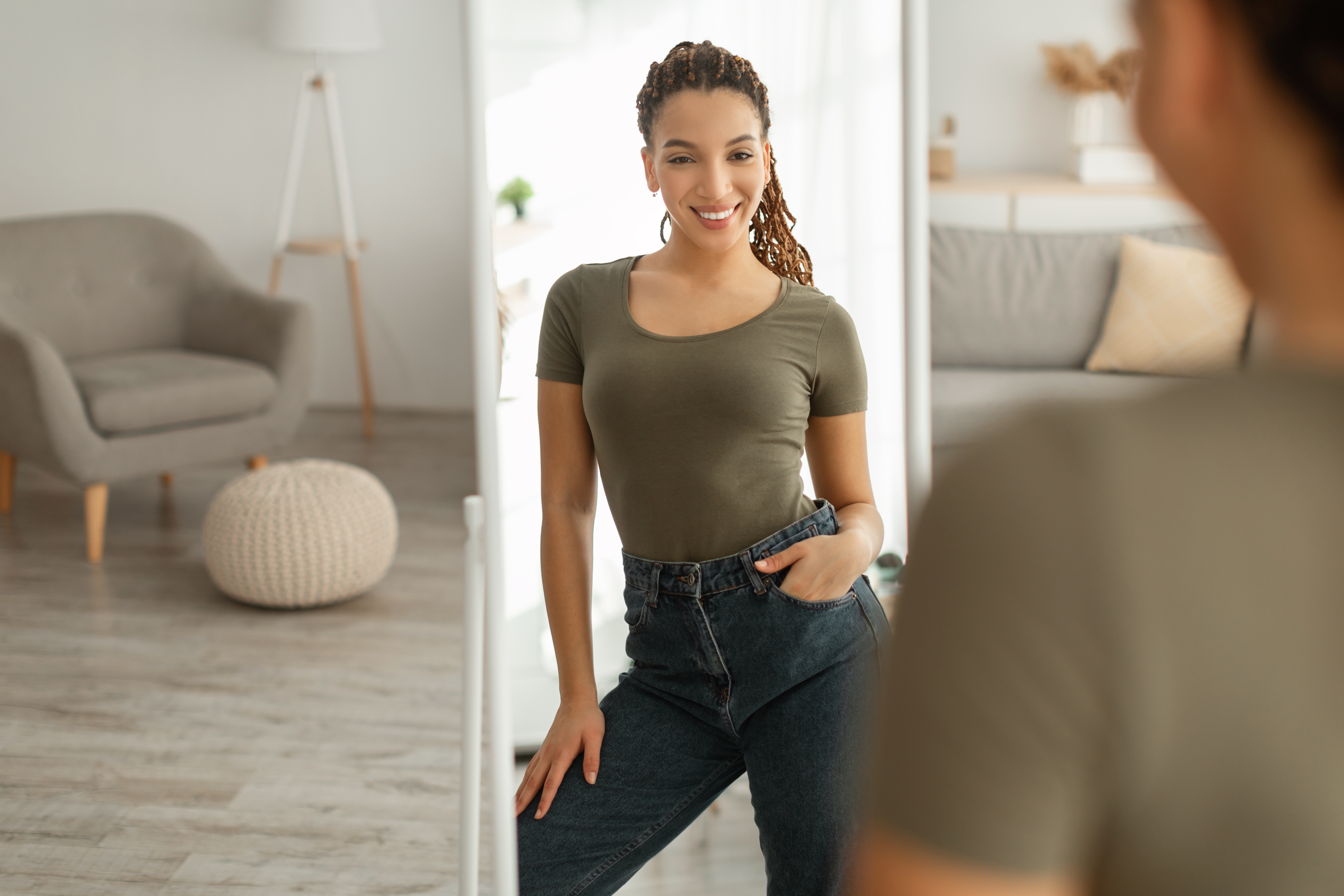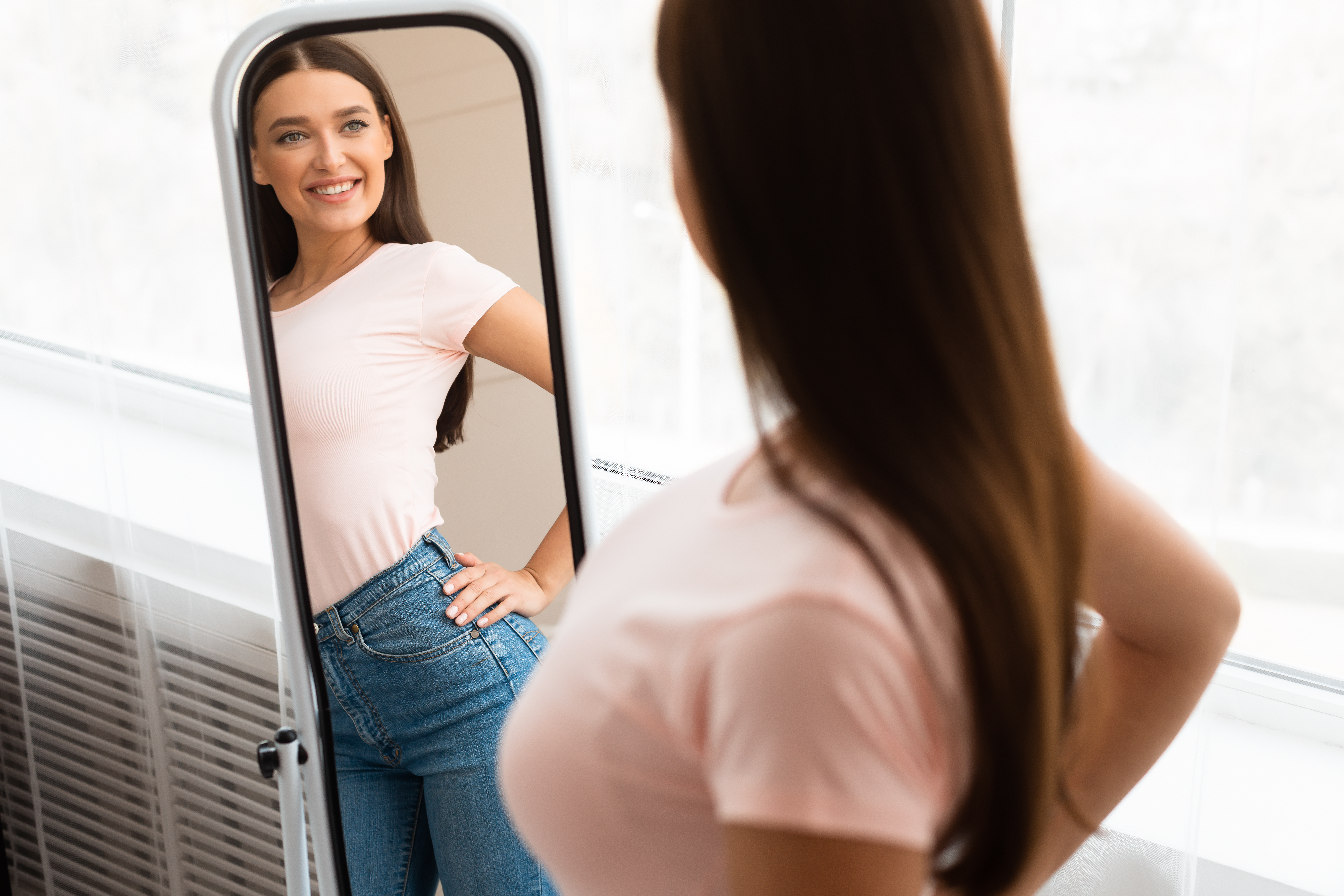 Perfect Weight. Happy Skinny Girl Looking At Reflection In Mirror Standing At Home. Successful Slimming Concept. Selective Focus