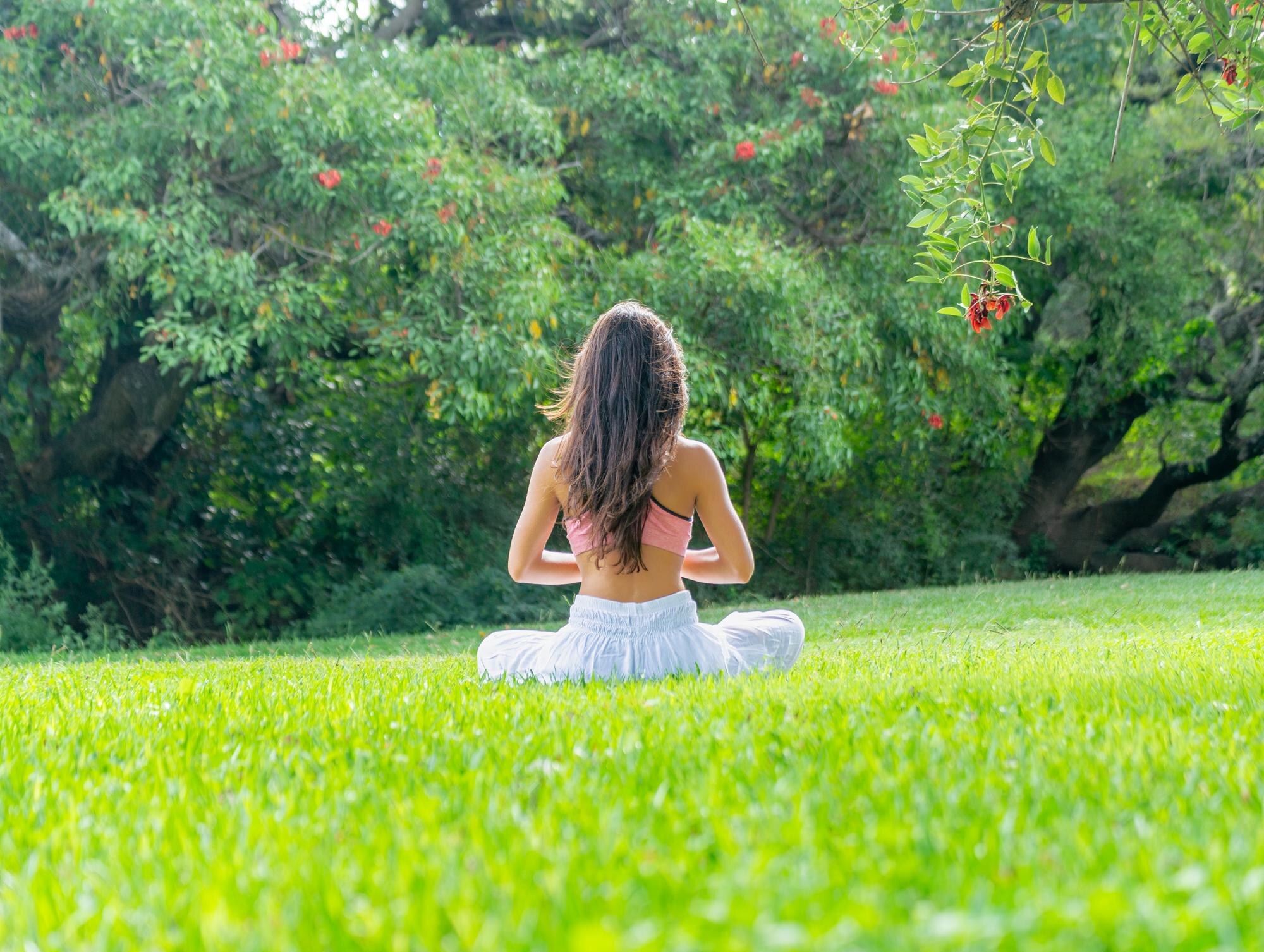 Young woman meditating peacefully under a large tree by the lake in the morning sunlight, practicing mindfulness and connection with nature outdoors