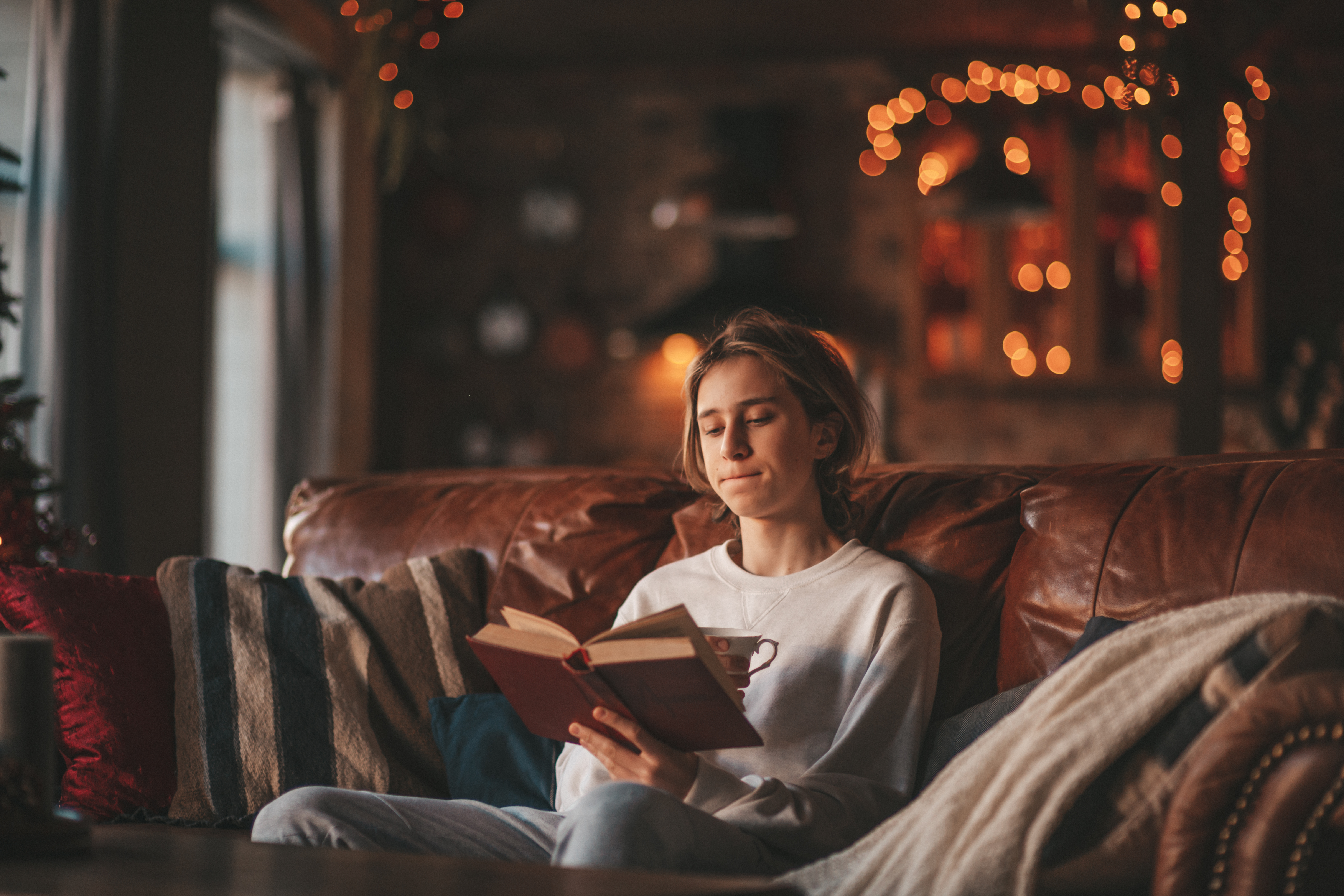 Burning candles and white sweaters on windowsill. Cozy autumn and winter concept, window with blinds.