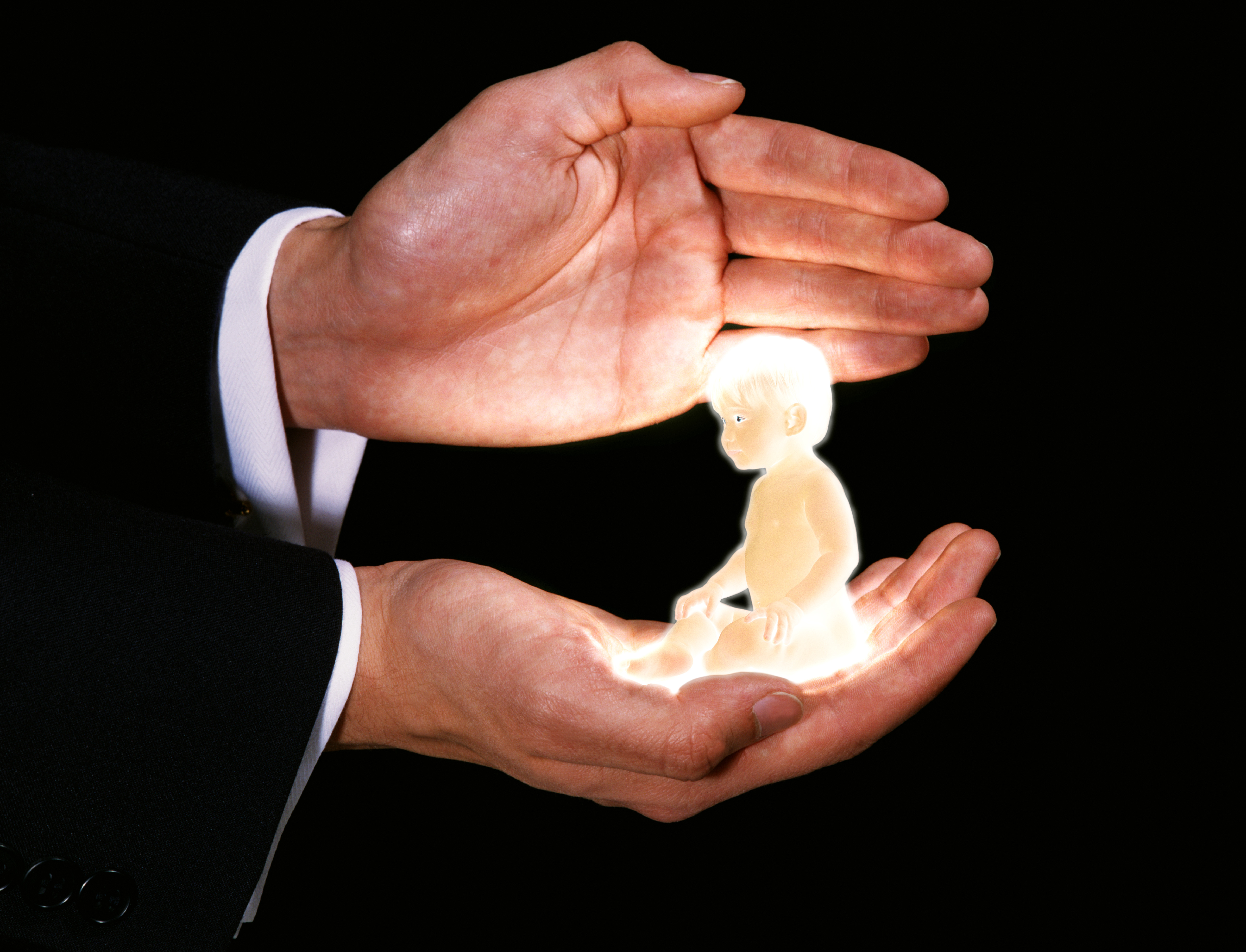 Man with a Baby in his Hands against Black Background