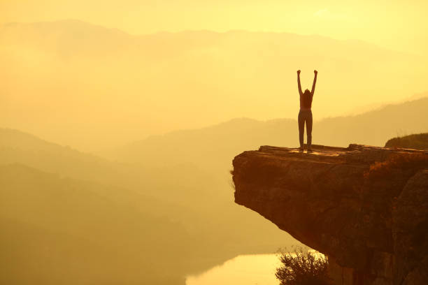 Woman silhouette celebrating in the top of a cliff